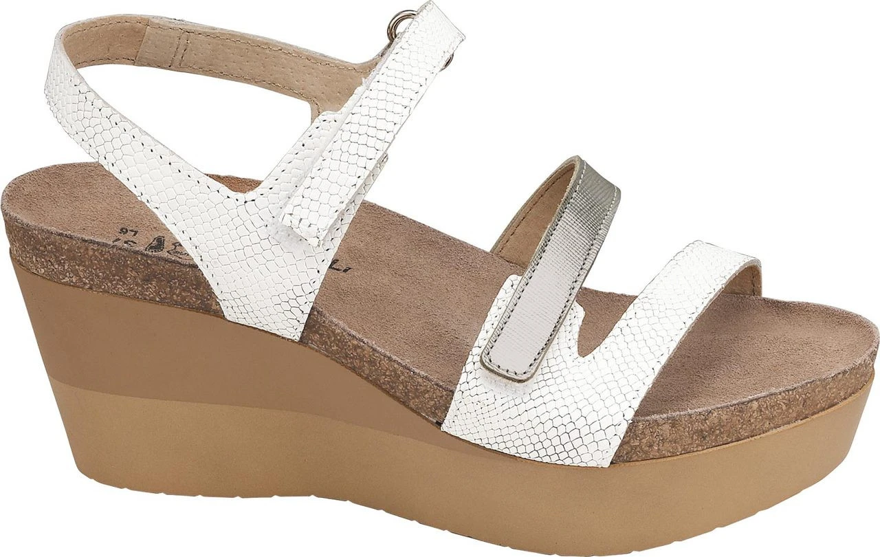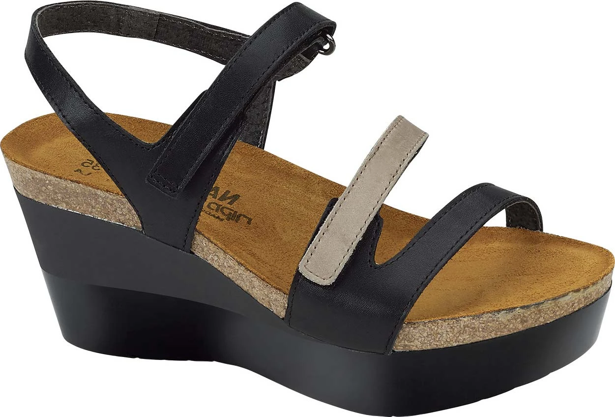 Englin’s Fine Footwear presents the women’s ‘Canaan’ from Naot. The Naot Canaan is a 3″ heel sandal that has a double hook and loop strap. This style also has a contrasting leather middle strap. Naot’s anatomic cork & latex footbed is wrapped in a pampering suede and molds to the shape of the foot with wear. This style has a 3″ polyurethane sole.