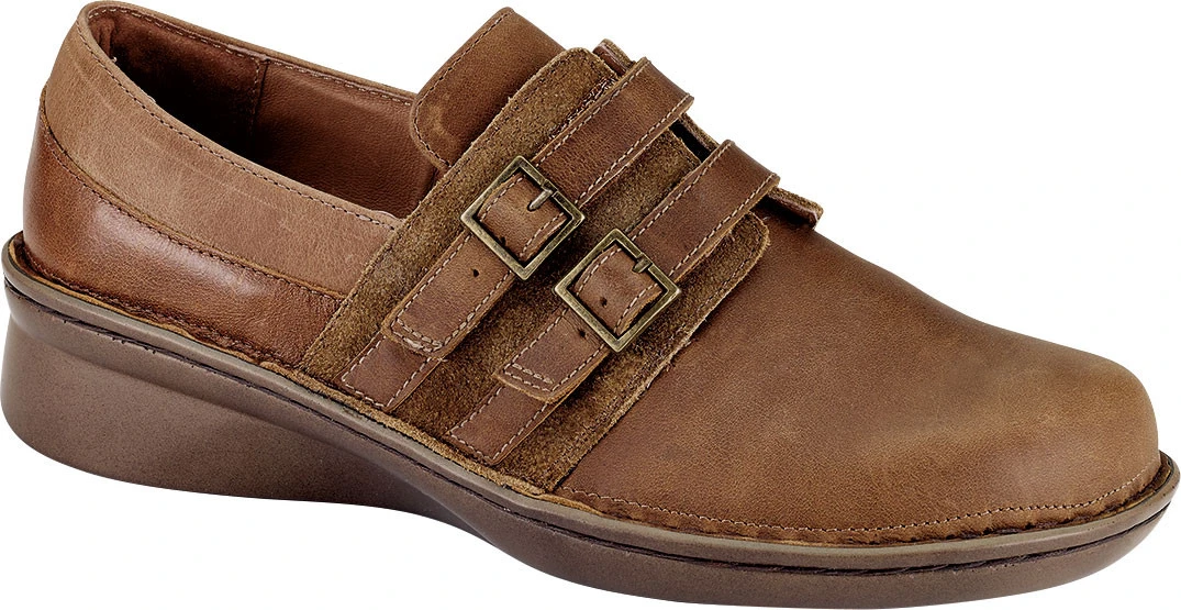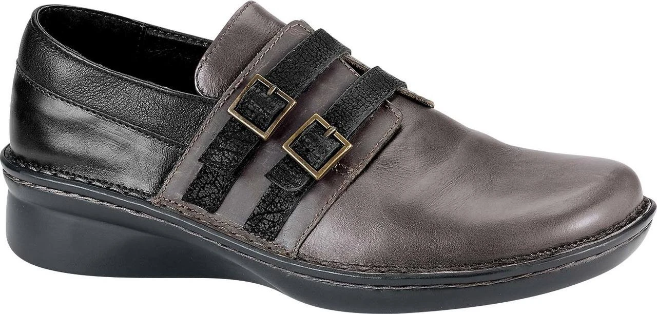Englin’s Fine Footwear presents the women’s ‘Celesta’ from Naot. The Naot Celesta is a flat shoe with contrasting leathers and faux buckle hook & loop straps. This style has a slightly wider fit and features a padded heel cup and padded tongue for ultimate comfort. This shoe has padded technical lining for comfort, warmth & moisture absorption. Naot’s removable, anatomic cork & latex footbed is wrapped in pampering suede and molds to the shape of the foot with wear. The Allegro Collection features a 1.5″ polyurethane sole which is extremely lightweight and durable.