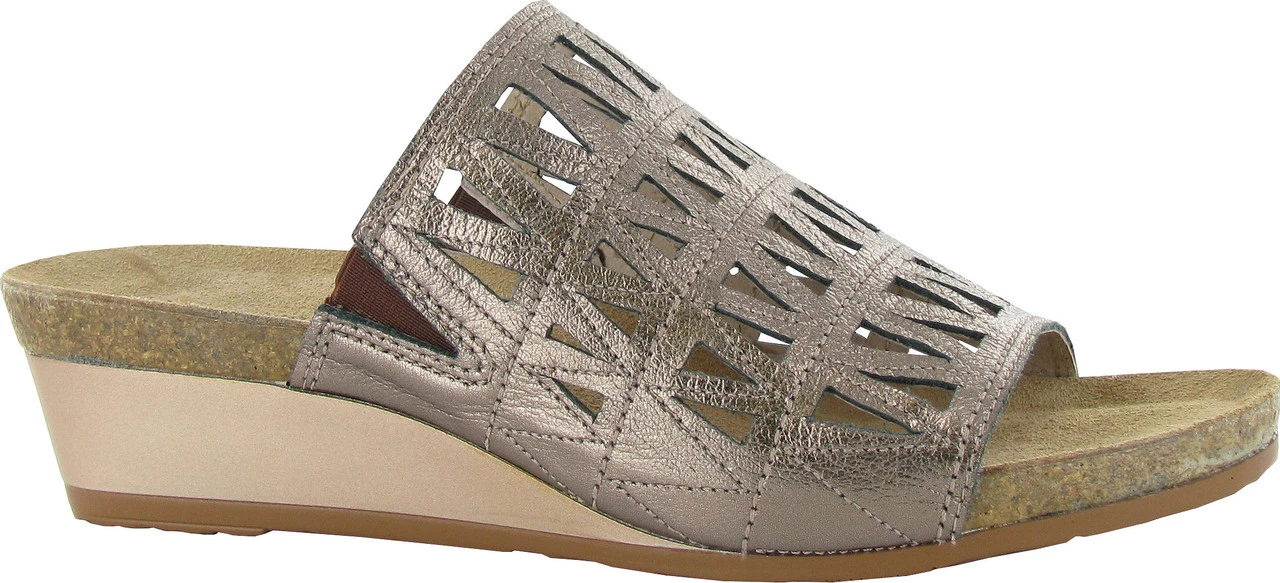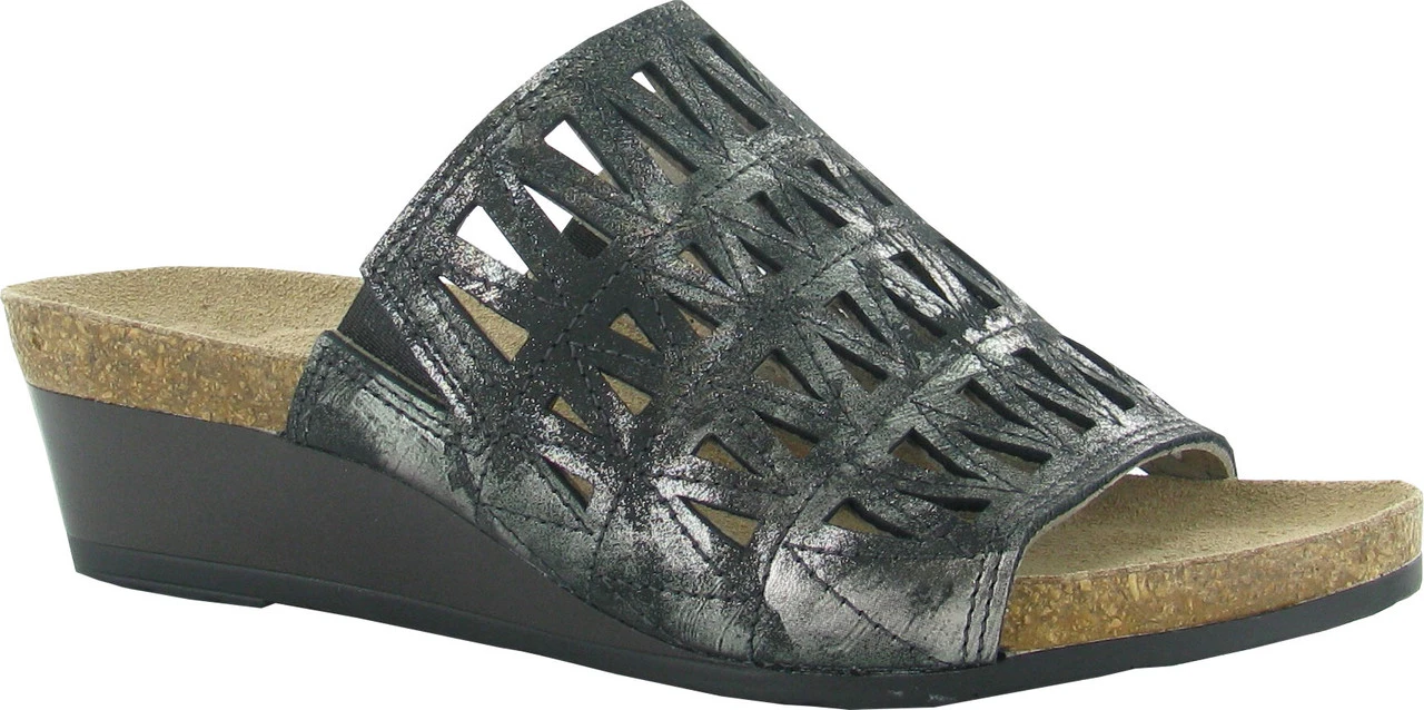 Englin’s Fine Footwear presents the women’s ‘Crown’ from Naot. The Crown is a fashionable slide with unique geometric cutouts. It has double gore for extra adjustability. Naot’s anatomic cork & latex footbed is wrapped in a pampering suede and molds to the shape of the foot with wear.