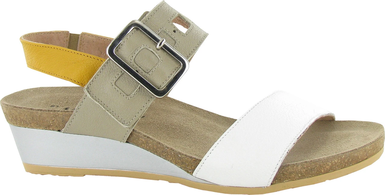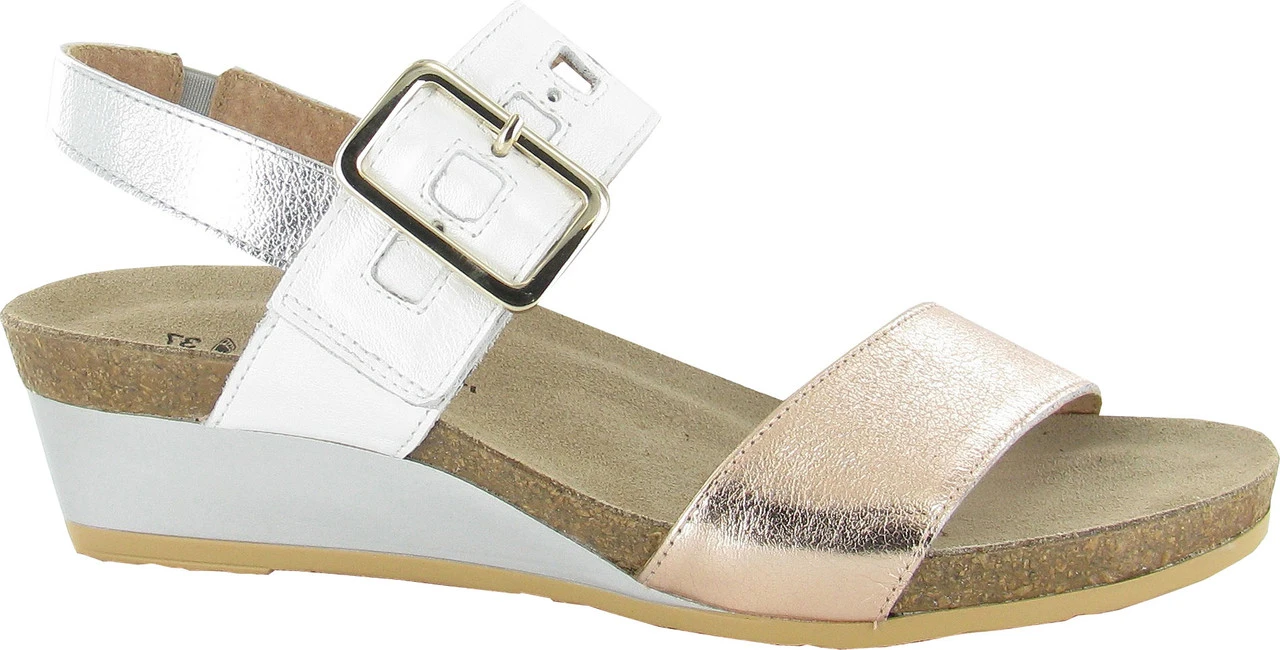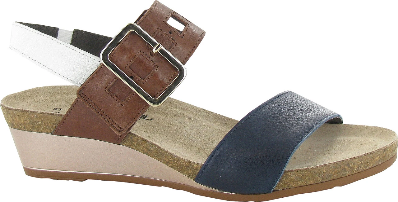 Englin’s Fine Footwear presents the women’s ‘Dynasty’ from Naot. Go day to night with all day comfort and style in the Dynasty wedge. This sandal features fun multi colored straps and a hook and loop closure for adjustability. Naot’s anatomic cork & latex footbed is wrapped in a pampering suede and molds to the shape of the foot with wear.
