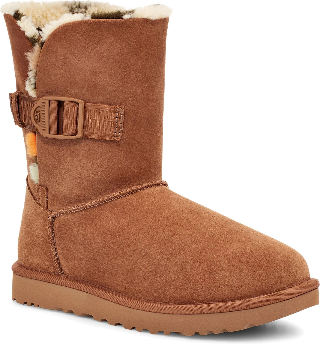 Englin’s Fine Footwear presents the women’s ‘Bailey Buckle Cali Collage’ from UGG. Featuring colors inspired by the diverse landscapes of California, this update to the iconic Bailey Boot features a cuffable shaft with multicolor UGGplush™ lining, plus a functional buckle closure for easy on and off. Enhancing your individuality, no two pairs are exactly alike. Due to the unique nature of the upper material used for this product, the item you receive may vary in color, texture, and/or pattern from the sample pictured on our site.